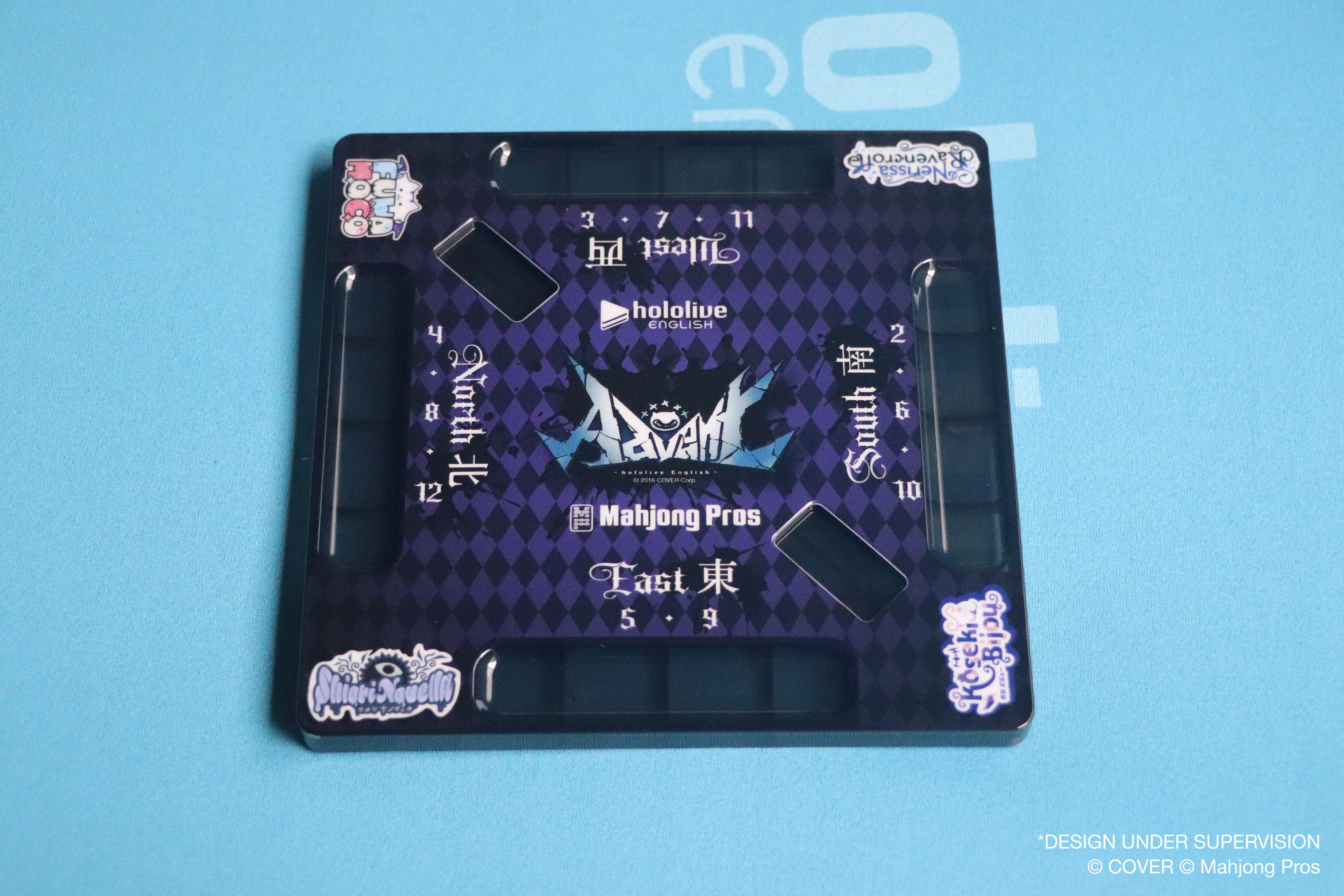 The Mahjong Pros x hololive English -Advent- Limited Mahjong set is a tribute to Shiori Novella, Koseki Bijou, Nerissa Ravencroft, Fuwawa Abyssgard, and Mococo Abyssgard. This exclusive set includes a completely custom themed mahjong set tailored to include elements from each member, carrying case, point sticks, mahjong compass, point chips, and dice.